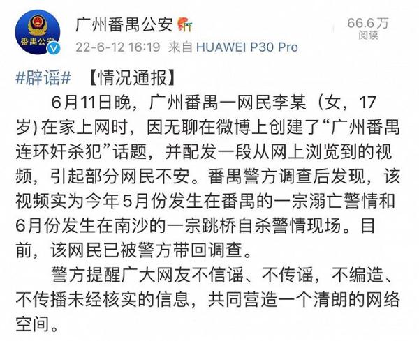 6月12日,@广州番禺公安 发布情况通报:6月11日晚,广州番禺一网民李某(女,17岁)在家上网时,因无聊在微博上创建了“广州番禺连环奸杀犯”话题,并配发一段从网上浏览到的视频,引起部分网民不安。番禺警方调查后发现,该视频实为今年5月份发生在番禺的一宗溺亡警情和6月份发生在南沙的一宗跳桥自杀警情现场。目前,该网民已被警方带回调查。