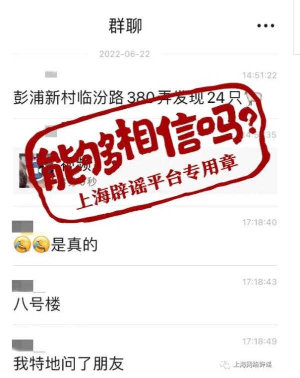 6月22日,一则圈群聊天记录称静安区彭浦新村临汾路380弄发现24例阳性,整个小区都封了。不少网友向上海辟谣平台询问网传的说法是否准确。