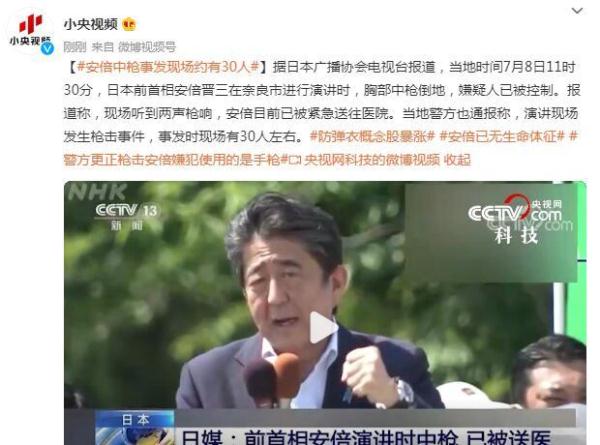 据日本广播协会电视台报道,当地时间7月8日11时30分,日本前首相安倍晋三在奈良市进行演讲时,胸部中枪倒地,嫌疑人已被控制。报道称,现场听到两声枪响,安倍目前已被紧急送往医院。当地警方也通报称,演讲现场发生枪击事件,事发时现场有30人左右。