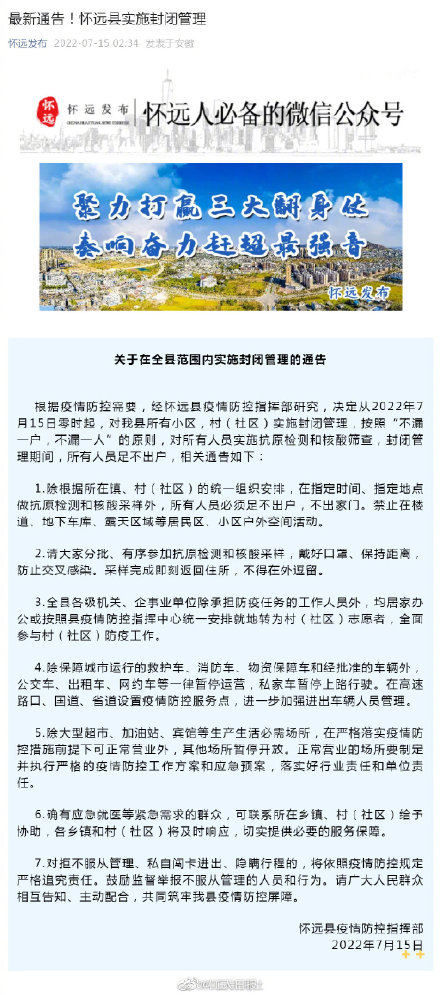 据“怀远发布”微信公众号消息:根据疫情防控需要,经怀远县疫情防控指挥部研究,决定从2022年7月15日零时起,对怀远县所有小区,村(社区)实施封闭管理,按照“不漏一户,不漏一人”的原则,对所有人员实施抗原检测和核酸筛查,封闭管理期间,所有人员足不出户。