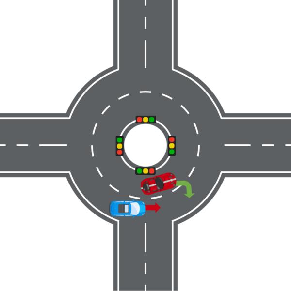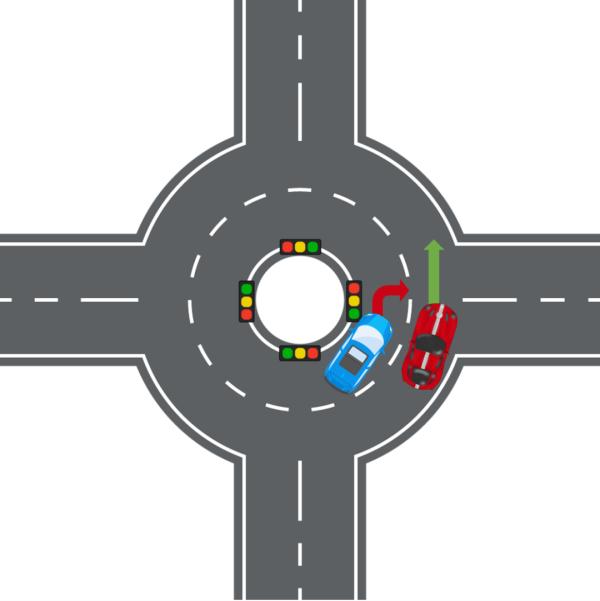 (如上图,蓝车应礼让红车优先驶出环岛)