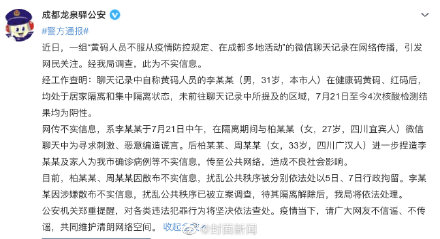 近日,一组“黄码人员不服从疫情防控规定、在成都多地活动”的微信聊天记录在网络传播,引发网民关注。经龙泉驿区公安分局调查,此为不实信息。