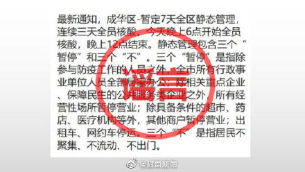 7月26日,一则“成华区-暂定7天全区静态管理”消息在网上流传。据成华区新冠疫情防控指挥部核实,此信息为谣言。