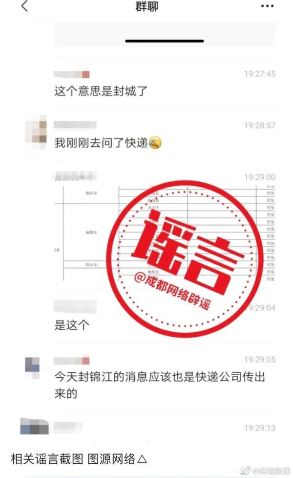 近日,网上流传群聊截图,内容提及“成都市青羊区、金牛区、成华区、新都区、蒲江县、武侯区、锦江区、龙泉驿区等区县快递停运”“今天封锦江的消息应该也是快递公司传出来的”等相关消息,引发部分民众“受疫情影响,无法收取快递”的担忧情绪。