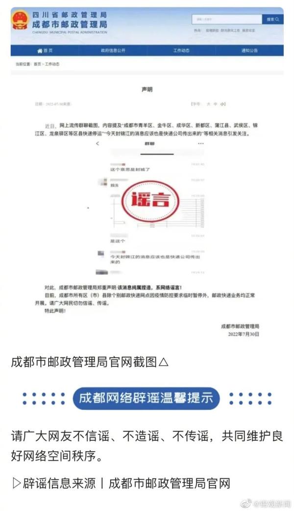 目前,成都市所有区(市)县除个别邮政快递网点因疫情防控要求临时暂停外,邮政快递业务均正常开展。请广大网民切勿信谣、传谣。