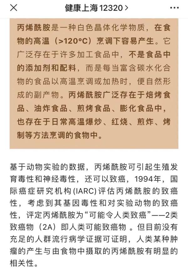 针对丙烯酰胺在油炸食品中不可避免的现象,国家卫生健康委员会(原卫生部)食品安全标准与监测评估司在2005年就曾建议公众:尽可能避免连续长时间或高温烹饪淀粉类食品;提倡合理营养,平衡膳食,改变油炸和高脂肪食品为主的饮食习惯,减少因丙烯酰胺可能导致的健康危害。