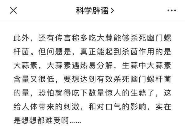 或是因为大蒜素对幽门螺杆菌有抑制作用,所以产生了“吃大蒜杀死幽门螺杆菌”的误解。如前所述,大蒜中的大蒜素含量很低,经过烹饪后更少,并不能达到“杀死幽门螺杆菌”目的。
