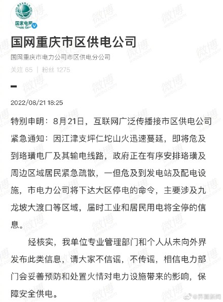 国网重庆市区供电公司发布《特别申明》:8月21日,互联网广泛传播接市区供电公司紧急通知:因江津支坪仁坨山火迅速蔓延,即将危及到珞璜电厂及其输电线路,政府正在有序安排珞璜及周边区域居民紧急疏散,一但危及到发电站及配电设施,市电力公司将下达大区停电的命令,主要涉及九龙坡大渡口等区域,届时工业和居民用电将全停的信息。 经核实,我单位专业管理部门和个人从未向外界发布此类信息,请大家不信谣,不传谣,相信电力部门会妥善预防和处置火情对电力设施带来的影响,保障安全供电。