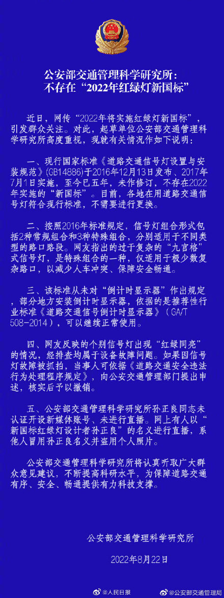 近日,网传“2022年将实施红绿灯新国标”,引发群众关注。对此,起草单位公安部交通管理科学研究所高度重视,就有关情况作说明。@公安部交通管理局