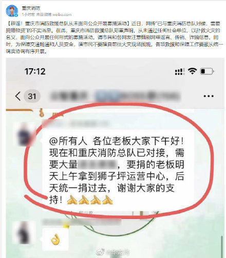 近日,有网友在微信群发消息称:“现在和重庆消防总队对接,需要捐赠物资。要捐的明天上午拿到狮子坪运营中心,后天统一捐过去,谢谢大家的支持!”对此,重庆市消防救援总队发表郑重声明:“从未通过任何社会单位,以扑救火灾的名义,面向公众开展任何形式的募捐活动。请市民和各网友注意甄别网络谣言、传销、诈骗信息。同时,为保障交通畅通和人员安全,请市民不要擅自前往火灾现场围观,各项救援和保障工作要服从统一调度协调有序开展。”