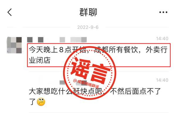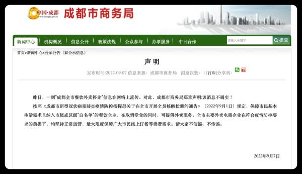 针对网传信息,成都市商务局于9月7日通过官方网站发布声明:该消息不属实!按照《成都市新型冠状病毒肺炎疫情防控指挥部关于在全市开展全员核酸检测的通告》(2022年9月1日)规定,保障市民基本生活需求且纳入市级或区级“白名单”的餐饮企业,在取消堂食的同时,可提供外卖服务。全市主要外卖电商企业在符合疫情防控要求的前提下,均坚持正常运营,最大限度保障广大市民线上订餐等消费需求。请大家不信谣、不传谣。