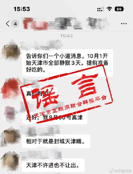 今日,接举报,有网民在网上传播“10月1日开始天津市全部静默3天”“相当于封城天津”“天津不许进也不让出”等涉疫消息,引发部分市民关注。经核实,此信息为谣言。