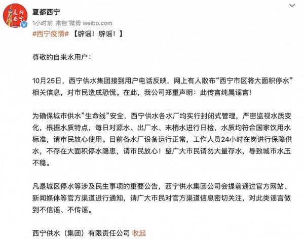 央视网消息:据@夏都西宁,西宁供水(集团)有限责任公司发布辟谣消息称,10月25日,西宁供水集团接到用户电话反映,网上有人散布“西宁市区将大面积停水”相关信息,对市民造成恐慌。供水公司表示,此传言纯属谣言。目前各水厂设备运行正常,工作人员24小时在岗进行保障供水,不存在大面积停水隐患。望广大市民请勿大量存水,导致城市水压不稳。