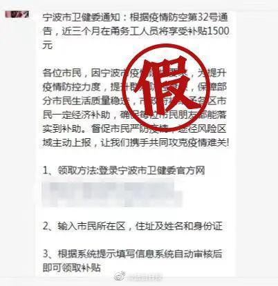 近日,一则“宁波市卫健委通知”在宁波本地社交平台传播,通知称“根据疫情防控第32号通告,近三个月在甬务工人员将享受补贴1500元”。信息中注明领取方法为点击登录网络链接,输入市民姓名、身份证、住址等信息后待系统审核。