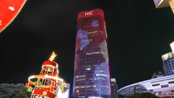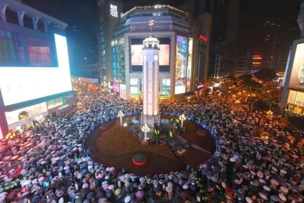 △12月31日晚10点,市民们冒雨在解放碑下等待新年的钟声