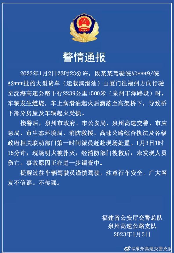 人民网北京1月3日电 (记者梁秋坪、郝萍)福建省公安厅交警总队泉州高速公路支队3日发布警情通报称,2023年1月2日23时23分许,段某某驾驶皖AD***9/皖A2***挂的大型货车(运载润滑油)由厦门往福州方向行驶至沈海高速公路下行2239公里+500米(泉州丰泽路段)时,车辆发生燃烧,车上润滑油起火后滴落至高架桥下,导致桥下部分房屋及车辆起火受损。