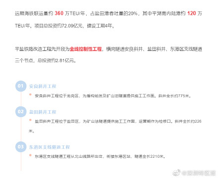 作为世界级枢纽港,全球最繁忙的集装箱码头之一,「盐田港」的业务十分繁忙。为了优化运输结构、降低碳排放、提升港口竞争力,这条承担着重要海铁联运功能的平盐铁路改造工程先开段,于近日正式进场施工啦! 项目建成后,将可以提高盐田港把货物运输到内地的能力,对于破解“港城矛盾”具有重大意义。同时也是深圳贯彻落实“一带一路”“双碳”“双区”等国家战略的重要实践。(深圳交通)