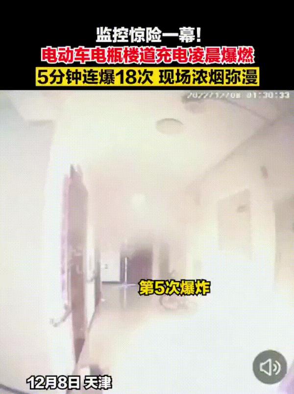 2022年12月8日凌晨,天津某小区一楼道内,电动自行车正在充电,突然发生爆燃,在短短5分钟内连爆18次!