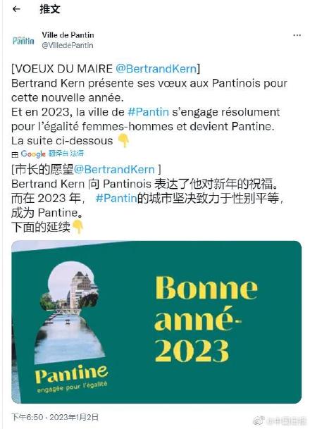 据路透社和法新社报道,为了促进性别平等,法国巴黎郊区一小镇本周将小镇名由Pantin改为女性化名字Pantine(潘婷),在原名末尾加了一个字母“e”,表示阴性。