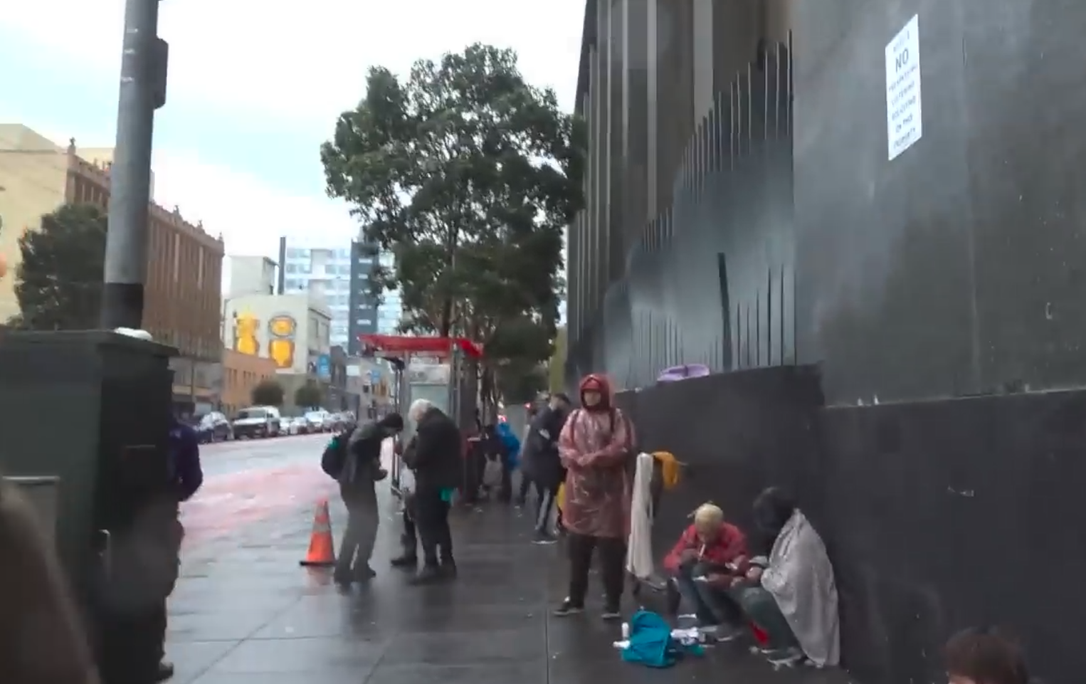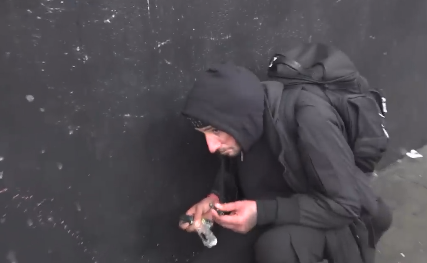 美国男子里奇·韦恩拍摄的画面显示,旧金山一座公交车站被毒贩和瘾君子霸占,成了露天贩毒市场。在那里,毒贩戴着口罩,从头到脚一身黑衣服,光天化日下进行毒品交易。瘾君子或蹲在街边吸毒,或情绪激动行为失常。