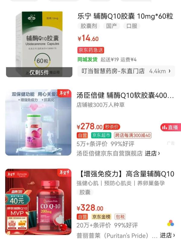 由于迅猛增长的需求,辅酶Q10一度在淘宝、京东等平台断货。1月9日,断货现象有所好转。目前,京东、天猫等平台均有辅酶Q10现货销售,在京东平台上,销量排名前十的辅酶Q10价位约在200-400元不等。