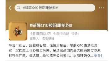 公开资料显示,辅酶Q10,俗称维生素Q,英文名称是coenzymeQ10,别名泛醌、癸烯醌。辅酶Q10是一种集医用、营养保健于一体的化合物,具有抗氧化、激活细胞呼吸、提高人体免疫力等作用,在食品、医药、化妆品等多个领域具有较高的应用价值。