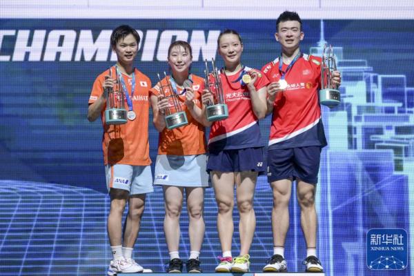 ↑郑思维(右一)/黄雅琼(右二)与渡边勇大(左一)/东野有纱在颁奖仪式上合影。新华社记者 朱炜 摄