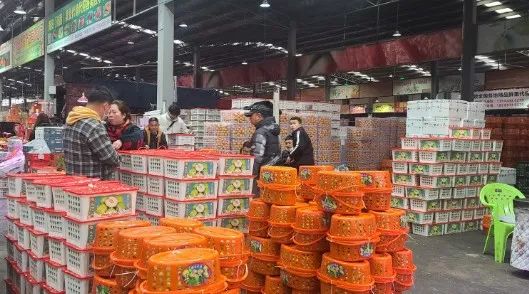 车厘子、桂圆、橘子,这些过年期间的热门水果,另外还有肉品、蔬菜、冷冻海鲜,嘉年华上琳琅满目的农副产品,供市民选择。早上11点过,已经有不少市民买了一箱箱的水果带走了。