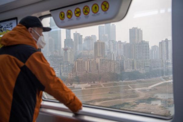 1月18日,在重庆轨道交通10号线列车上,乘客在欣赏窗外的重庆城市景色。