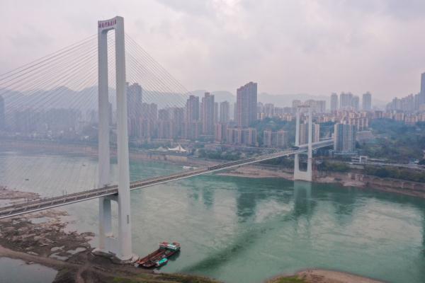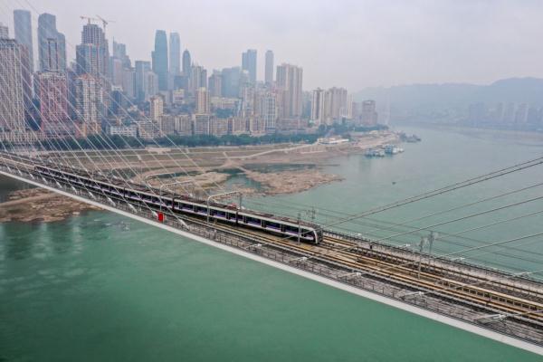 1月18日,重庆轨道交通10号线列车正在通过南纪门轨道大桥(无人机照片)。