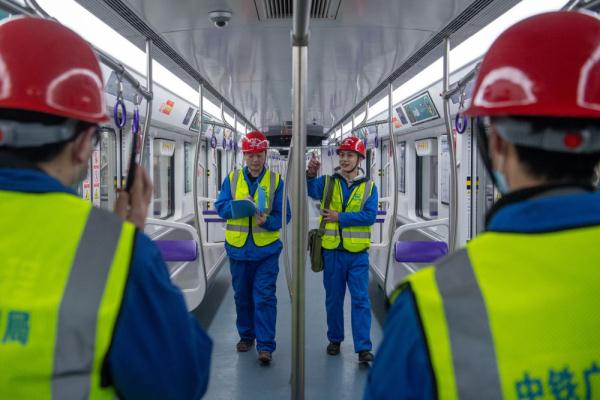 1月16日,工作人员在重庆轨道交通10号线列车上进行巡检作业。