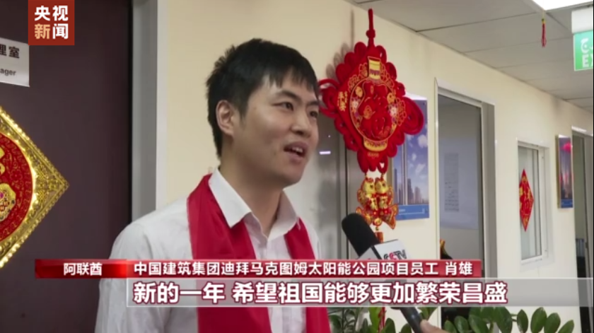 中国建筑集团迪拜马克图姆太阳能公园项目员工肖雄:虽然远在异国他乡,但是和同事还有朋友们一起参加这个新春活动,让我感到过年的氛围,还有公司的关怀。新的一年,希望祖国能够更加繁荣昌盛,希望我的家人们能够平平安安,健健康康。