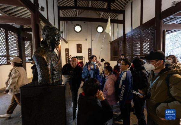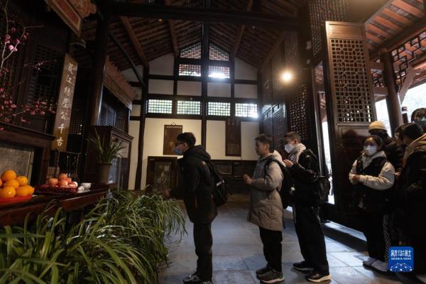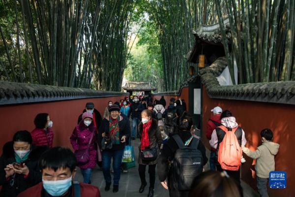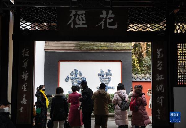 1月28日,游客在四川成都杜甫草堂游览。