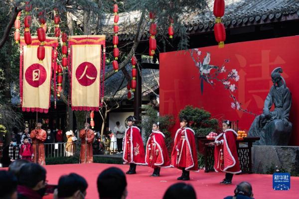 1月28日,在四川成都举行的“人日”游草堂、祭拜诗圣杜甫活动现场,草堂小学的学生代表诵读杜甫诗。