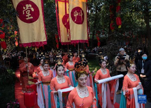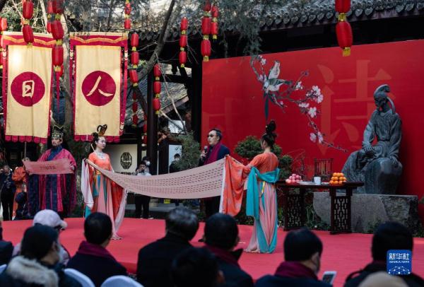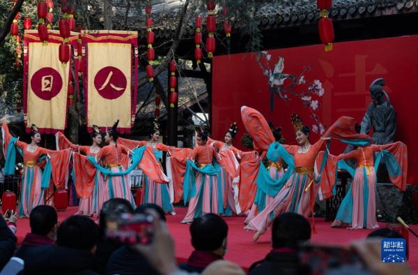1月28日,在四川成都举行的“人日”游草堂、祭拜诗圣杜甫活动现场,演员在表演舞蹈。