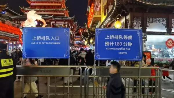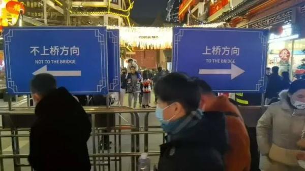 大客流下,上九曲桥的人们在中心广场东侧就进行了分流,“不上桥方向”和“上桥方向”的立牌指向一左一右,清晰明了。