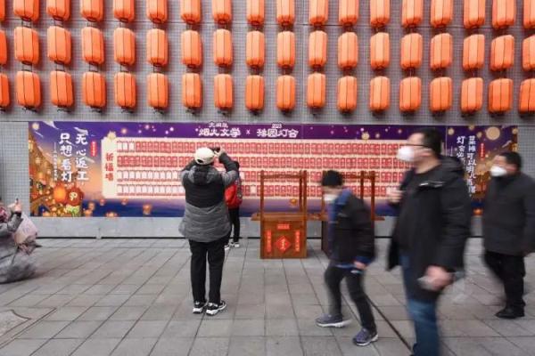 九曲桥畔,不少市民游客来到一面高墙前互动打卡。祈福墙上数百张祈福卡不到两小时就被各种心愿填满,“2023考研上岸”、“我要当大班长”、“事事顺利一切都好”…… 既有对自己新一年的勉励,也有对新年的美好愿景。