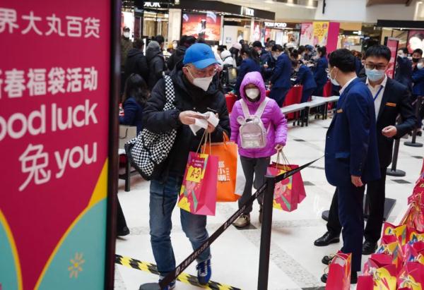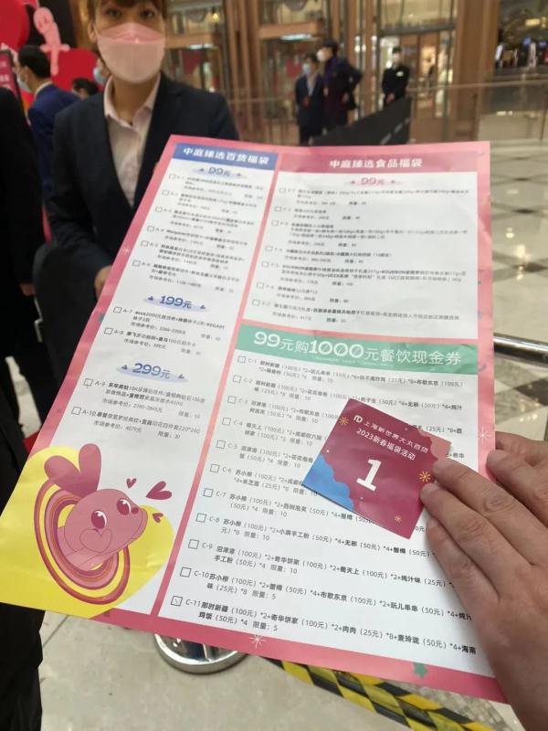 9点45分,等候已久的消费者终于拿着号码牌走进商场,只见红红火火的新春福袋堆满中庭,洋溢着浓浓的新春气息,大家摩拳擦掌,想要第一时间打开“幸运宝箱”。