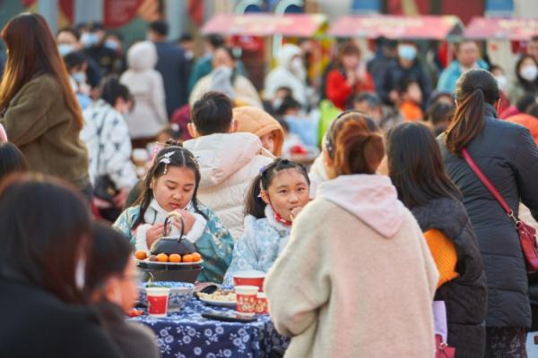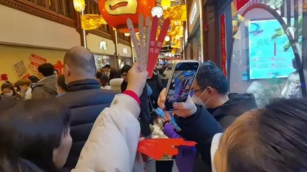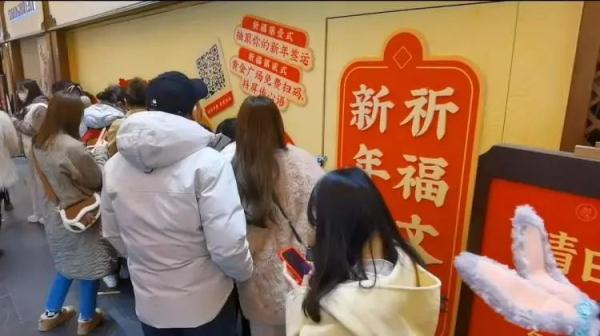 在“祈福第壹式”抽取你的新年签运活动上,队伍沿着文昌街排出了老远,等候的人群中有的带着毛茸茸的兔子耳朵,提着兔子灯笼,有的吃着团团软软的彩色棉花糖。