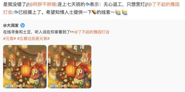 今天,大润发官微喊话豫园灯会“在线寻鱼”,引来热心网友帮忙找鱼,原来,在豫园灯会最火打卡地九曲桥前, “在逃”老黄鱼化身网友嘴替, “无心返工,只想看灯”, 网友调侃,是我没错了。鱼群、虾、土豆、白菜、汤圆等等都变身了“超市精灵”。