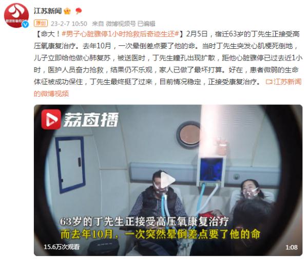 2月5日,宿迁63岁的丁先生正接受高压氧康复治疗。去年10月,一次晕倒差点要了他的命。当时丁先生突发心肌梗死倒地,儿子立即给他做心肺复苏,被送医时,丁先生瞳孔出现扩散,距他心脏骤停已过去近1小时,医护人员奋力抢救,结果仍不乐观,家人已做了最坏打算。好在,患者微弱的生命体征被成功保住,丁先生最终挺了过来,目前情况稳定,正接受康复治疗。