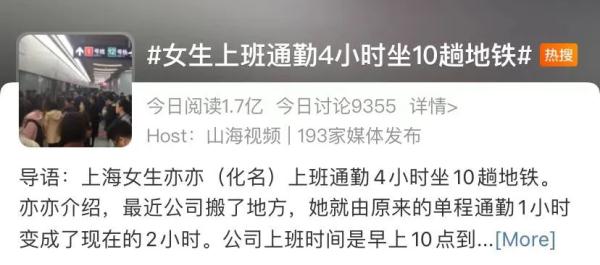 近日,上海一名女生亦亦(化名)称上班通勤要花4小时坐10趟地铁。亦亦介绍,最近公司搬了地方,她就由原来的单程通勤1小时变成了现在的2小时。公司上班时间是早上10点到晚上7点,她每天8点出门坐5次地铁,早高峰换乘时非常的累,晚上下班到家9点多了,洗完澡就想躺在床上什么都不想干。