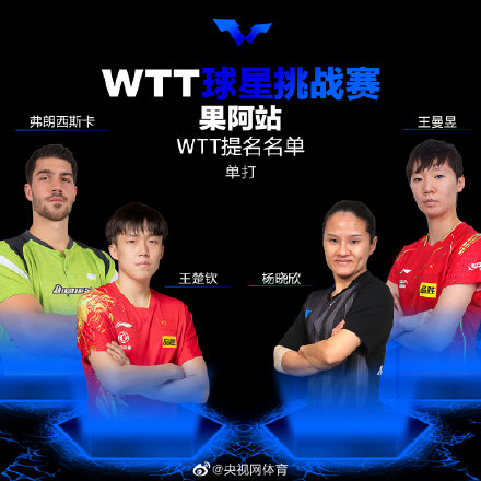 WTT球星挑战赛果阿站2023中国队完整参赛名单: 男单: 正赛:樊振东、马龙@captain龙 、@王楚钦___ 、@向小鹏- 、@袁励岑a 、@林詩棟y 、@Unique小周同志 、@梁俨苧 资格赛:@徐瑛彬bin 女单: 正赛:@孙颖莎 、@陈梦-乒乓球 、@王曼昱 、@L炜珊Ss 、蒯曼@kuaiman0207 、@小胖子何卓佳 男双: 正赛:樊振东/王楚钦、向鹏/林诗栋、梁靖崑/袁励岑 女双: 正赛:孙颖莎/王曼昱、王艺迪@迪214 /陈梦、蒯曼/何卓佳 混双: 正赛:王楚钦/孙颖莎 资格赛:樊振东/王曼昱