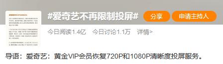 今年1月,爱奇艺App开始对投屏功能作出限制,之前黄金VIP会员支持最高 4K 清晰度投屏,现在只能选最低的480P清晰度,要想进行4K投屏必须购买白金VIP会员。此话题引发了广大消费者的讨论,上海市消保委也发表了相关观点。