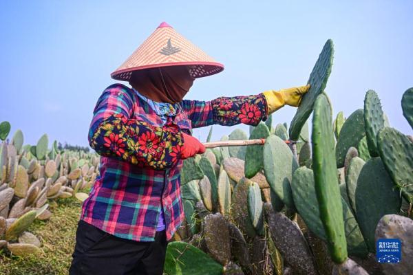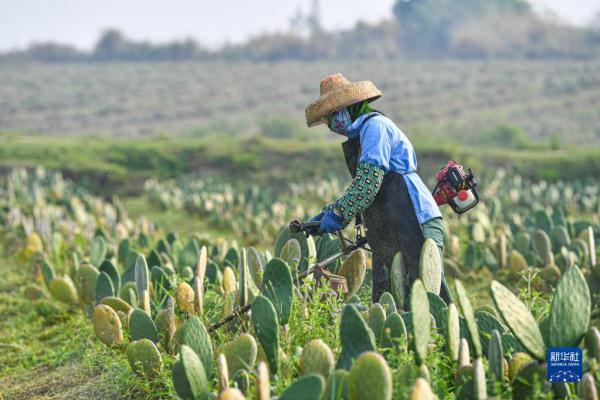 2月20日,工作人员在中美墨仙人掌种植基地劳作。