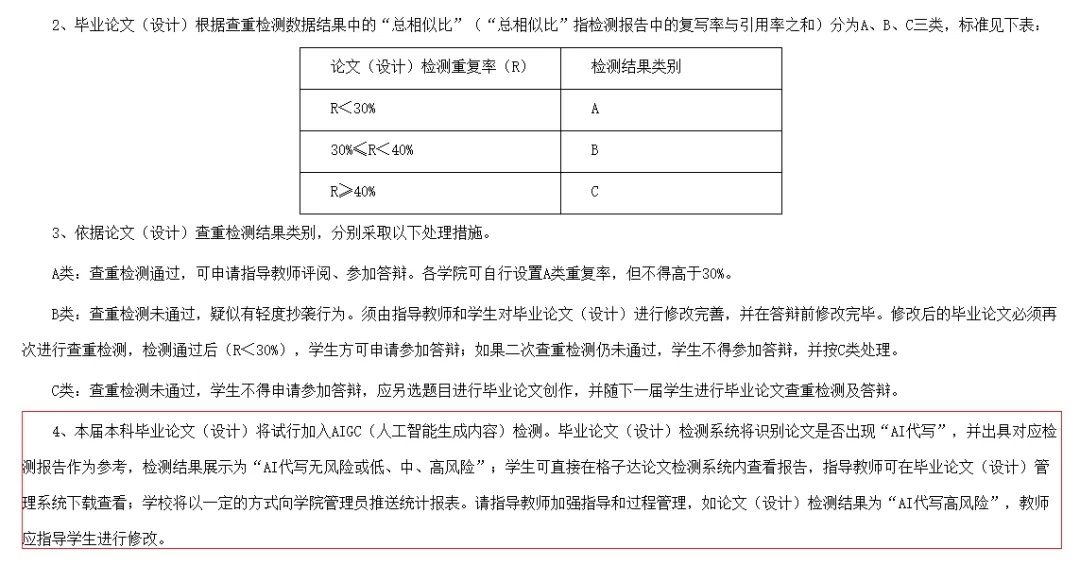 天津科技大学教务处发文规定,若本科生毕业论文中生成式AI检测的结果超过40%,学院将向学生发出警示,并要求其自查自纠;学生在收到警示后,需认真修改,由学院统一在相关平台检测通道进行复检。