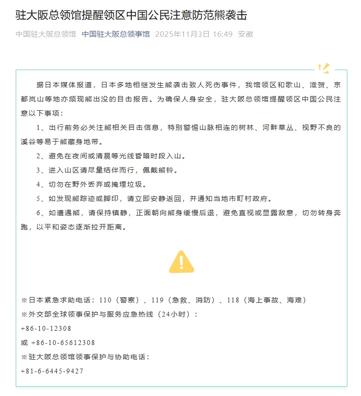 11月3日,中国驻大阪总领馆发布消息,提醒领区中国公民注意防范熊袭击——