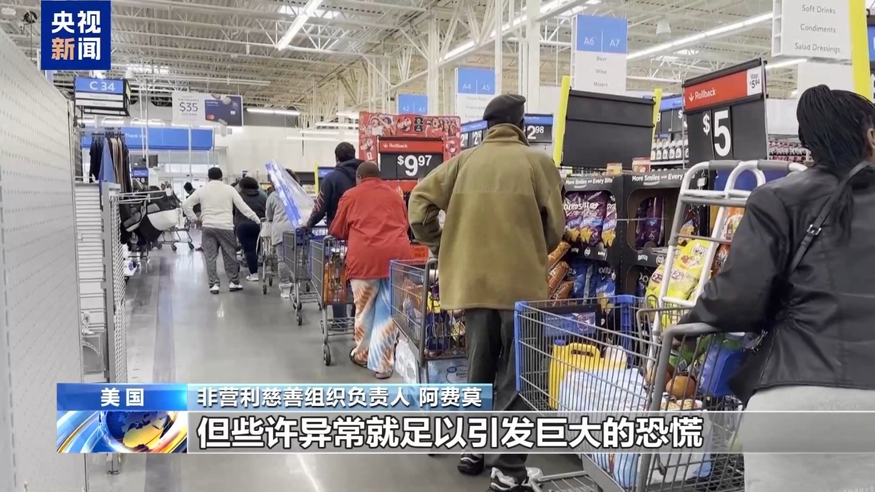 当地居民 凯伦:我现在必须赶紧过来,不然等风暴来袭,道路被封,我们就没法去商店了。家里的食物储备已经不多,我和丈夫这个月食品券的额度,也仅剩24美元,所以我觉得必须现在来寻求帮助,再晚可能就来不及了。货架上空空如也,大部分超市早已售罄。