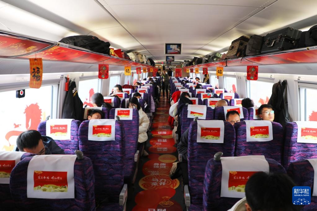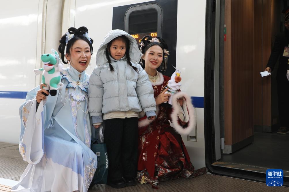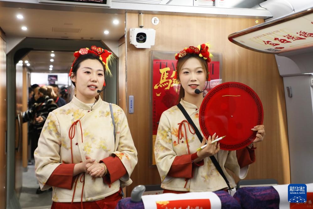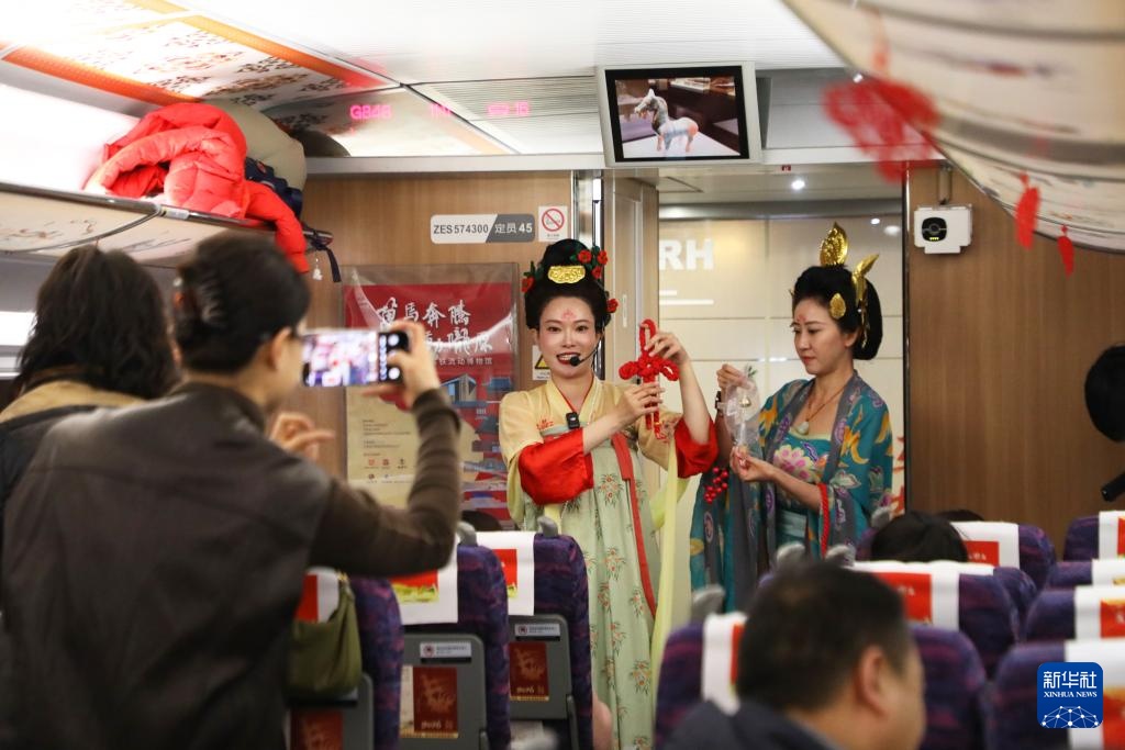 2月9日,由中国铁路兰州局集团有限公司、甘肃省文化和旅游厅、甘肃省文物局联合打造的“高铁流动博物馆”G848次列车从兰州西站发车,驶往广州南站。敦煌研究院、甘肃省博物馆等9家甘肃当地的国家一级博物馆,将陇原文脉“搬上”飞驰列车,让旅客在出行中触摸历史的温度,让传统年俗在春运车厢里焕发新彩。