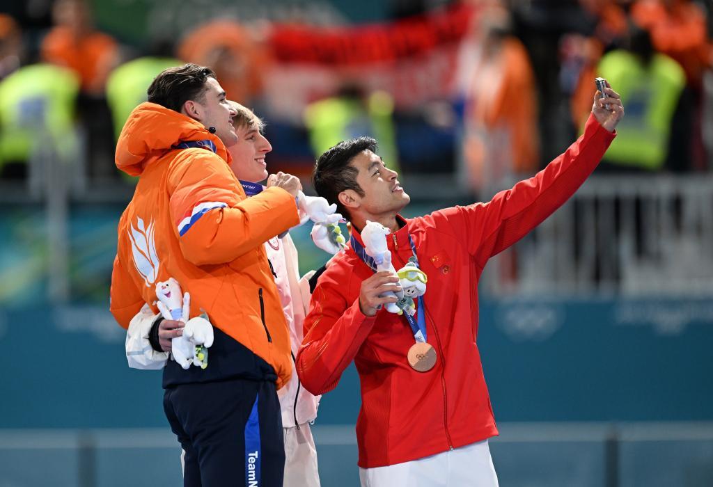 2月11日,冠军美国选手斯托尔兹(中)、亚军荷兰选手德布(左)和季军中国选手宁忠岩在颁奖仪式上自拍。新华社记者 武巍 摄